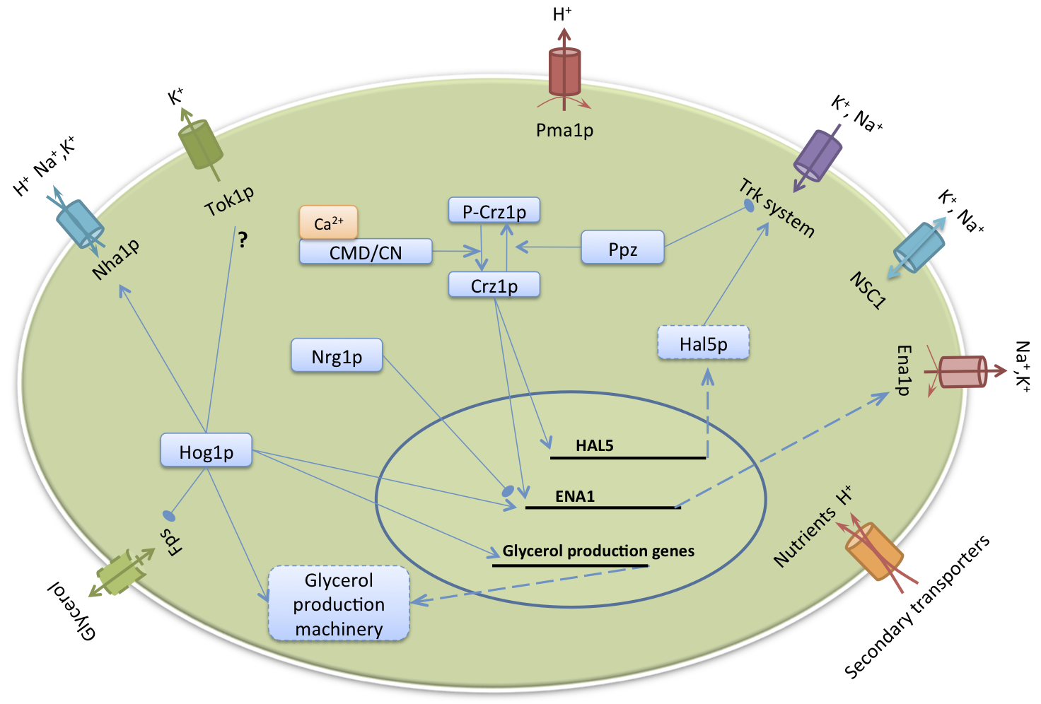 Yeast cells are able to tolerate and adapt to a variety of environmental stresses. An essential aspect of stress adaptation is the regulation of monovalent ion concentrations, which determines many parameters that are fundamental to cellular physiology, such as cell volume, plasma membrane potential and intracellular pH. The regulation is achieved through the remarkably coordinated activities of ion transporters, regulatory molecules and signaling pathways. During my PhD at Imperial College London, (with Piers Ingram and Ken Haynes) I have constructed a mathematical model to characterize the impact of ionic, osmotic and alkaline pH stresses on cellular physiology and analyze the role that individual components play in the cellular adaptation processes.